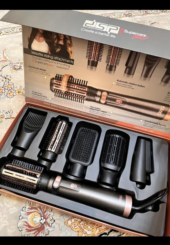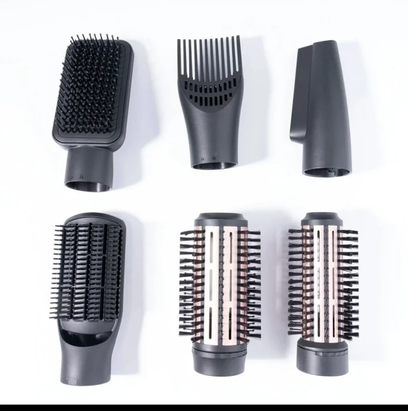 2 عدد برس چرخشی 50 میل و 38 میل برای حالت دهی ، برس ماساژ موی سر، برس تخت برای صاف کردن موی سر، برس انگشتی برای باز کردن گره موها و سری نازل هوا