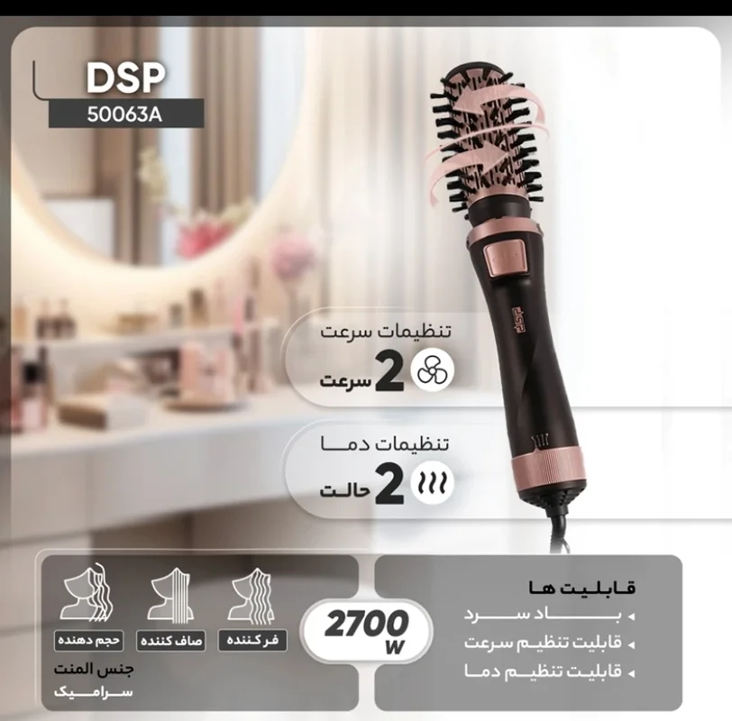 سشوار برسدار چرخشی حرفهای دی اس پی مدل 50063A، موتور DC با توان مصرفی 1000 وات، دارای قابلیت باد سرد، سیم گردان، با حالت فرکننده، حجمدهنده و صافکننده، وزن 500 گرم، تنظیم حرارت 2 حالته و کنترل سرعت 3 حالته، به همراه 5 عدد سری متمرکزکننده